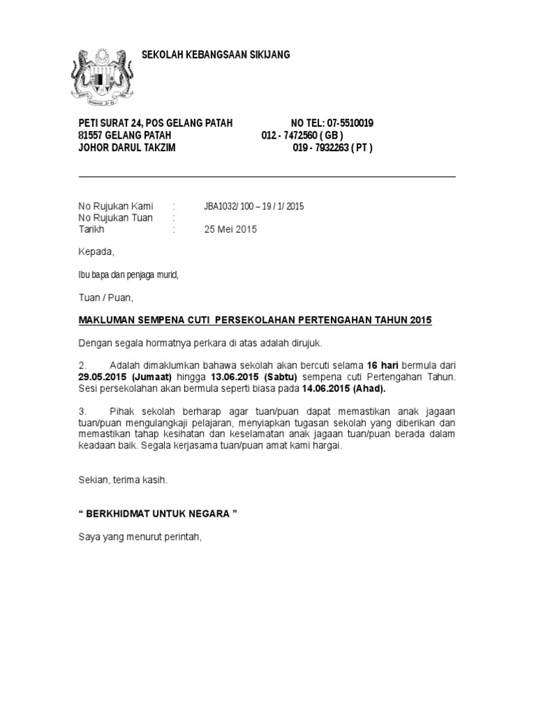 Contoh Surat Makluman Cuti Bergilir Kepada Ibubapa Pdf
