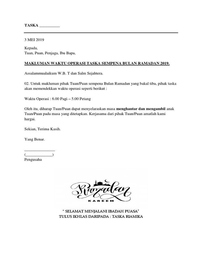 Contoh Surat Makluman Cuti Pemendekkan Operasi Sempena Puasa Ramadan Pdf